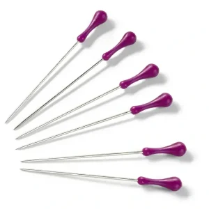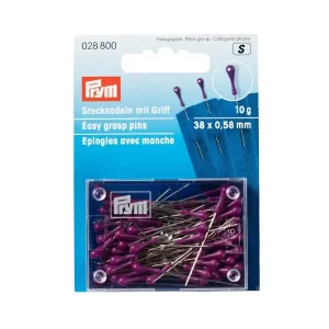 Alfinetes com um cabo longo e côncavo feito de plástico cor de ameixa. Graças a este, são fáceis de agarrar e podem ser perfeitamente guiados. A haste dos alfinetes, feita de aço de mola, tem uma rigidez de mola equilibrada. A sua ponta fina penetra facilmente em qualquer tecido, não danificando assim as fibras. No recipiente de armazenamento, a Prym oferece 10 g do alfinete fino com pega no tamanho 38 mm x 0,58 mm.
