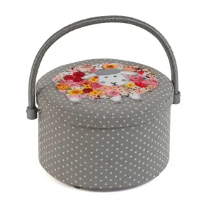 Caixa de costura para trabalhos manuais com tampa, em tecido 100% algodão com estampado de ovelha.