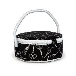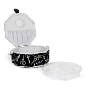 Caixa de costura Dritz em forma de octógono tem um tamanho ideal para manter à mão os materiais básicos de costura ou de bordado. O tecido é estampado com uma tesoura prateada sobre um fundo preto. A pega, tem um acabamento em cinzento prateado dando um toque elegante.