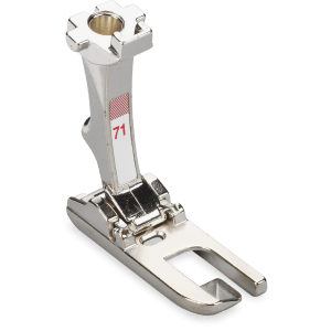 A canaleta pequena no lado esquerdo do calcador de sobrecostura #71 mantém a borda do tecido posicionada para a segunda costura. Este calcador versátil também é adequado para costurar roupas reversíveis.