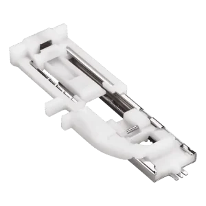 No entanto, antes de começar, levante o calcador com corrediça e guie o cordão pelo alfinete atrás, puxe-o para a frente por baixo do calcador e prenda-o à frente.