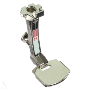 O calcador para franzir #16 está disponível em duas larguras diferentes. A versão mais larga deve ser usada com máquinas de costura com largura de ponto até 9 mm.