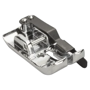 O calcador de patchwork tem um orifício adicional, à esquerda do orifício da agulha, permitindo obter costuras com uma profundidade de 3,18 mm. Para tal, mova a agulha toda para a esquerda e guie o tecido ao longo da borda interior esquerda do calcador.