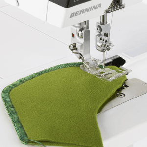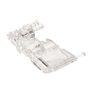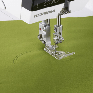 O design estreito e curto do calcador transparente permite coser de forma manobrável pequenas formas arredondadas e curvas. Para permitir um trabalho preciso, a faca pode ser desactivada para pequenas curvas e para o ponto de overloque de 3 fios estreito (RN). As pequenas curvas ficam perfeitas com pontos estreitos e um comprimento de ponto curto.