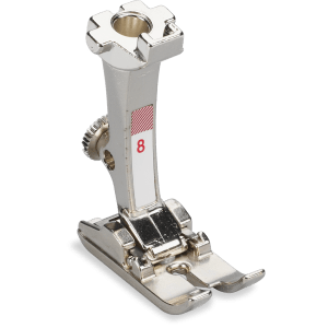 O calcador para gangas Bernina  #8 também é ideal para materiais finos e meio pesados de costura reta . Note que o  duplo transporte BERNINA somente funciona com os calcadores “D”.