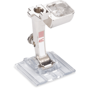 O calcador para nervuras e pontos decorativos com sola transparente #46C facilita costurar em feltragem e ornamentá-las com perfeição.