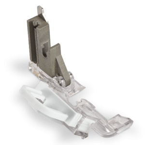 Para Vivos grandes O calcador para vivos XL permite-lhe produzir e coser tubagens de 6 a 10 mm de diâmetro. É adequado para pontos de overloque de 3/4 linhas. Ajustar a alavanca de compensação da altura premindo o trinco para se adaptar ao diâmetro dos seus debruns.