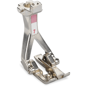 Para costurar juntos dois pedaços de tecido com o calcador #7, a tensão da linha é aliviada levemente para que a linha passe sobre o topo central do calcador. O ponto ziguezague usado forma circuitos frouxos que a seguir deslizam para trás, graças à abertura especial em “V” do calcador.