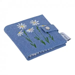 Carteira para agulhas em tecido de algodão com motivo bordado. Páginas interiores flexíveis para guardar agulhas e alfinetes. Fecho com botão de pressão.