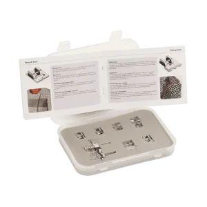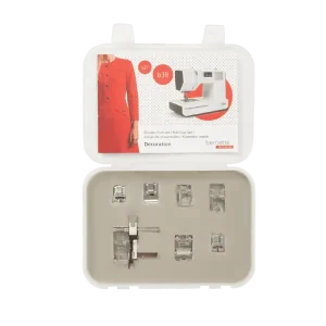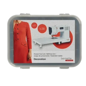 O conjunto de calcadores Decoração para bernette 37/38 tem como objetivo transformar uma costura simples numa obra de arte. Os calcadores incluídos, tais como os calcadores para missangas ou lantejoulas, facilitam a decoração de um casaco ou ajudam a dar vida a uma blusa simples. Outro destaque dos sete calcadores é o calcador para nervuras incluído, fornecido em dois tamanhos diferentes para ajudar a criar nervuras bem definidas e uniformemente espaçadas, conferindo um aspeto sofisticado e único, por exemplo, a projetos de decoração do lar. O conjunto de calcadores Decoração para a bernette 37/38 tem como objetivo transformar uma costura simples.