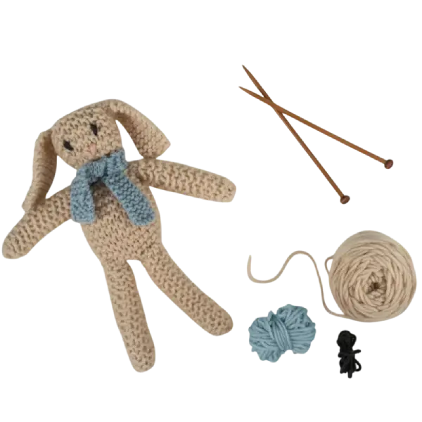 Kit iniciação tricot contém tudo o que precisa para criar um adorável coelhinho de estimação. Com pontos simples, este projeto é uma ótima introdução ao tricô para jovens e ainda permite que eles escolham a cor do cachecolzinho como toque final!