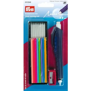 A lapiseira de giz da Prym é adequado para traçar, escrever e marcar em quase todas as superfícies. É ideal para trabalhos manuais e passatempos, tais como costura, quilting, artesanato e construção de modelos. A lapiseira recarregável pode ser utilizada não só para fazer marcas de linhas exatas, mas também para fazer marcações pontilhadas. Na extremidade superior da lapiseira existe um botão com uma borracha; prima o mecanismo de retenção para mudar o giz. A embalagem inclui 8 giz brancos e 8 coloridos, a lapiseira de giz e um afiador especial para os giz. A lapiseira é fornecida com um giz branco. Os giz são económicos na utilização e são fornecidos numa embalagem de proteção para o transporte.