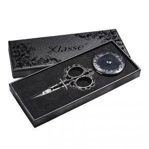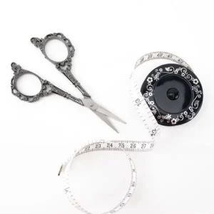 Cada peça é preta piano com desenhos florais feitos de folha de prata. Na caixa de armazenamento decorativa, encontrará uma tesoura de bordar de ponta fina de feita com aço inoxidável de qualidade e uma fita métrica retrátil de 150cm com parte traseira magnética.